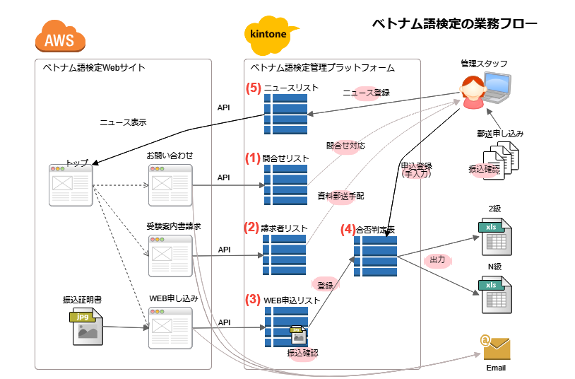 - お問い合わせ、受験申込、問題集の購入といった機能を一元的に受け付け、収集されたデータをKintoneに自動連携。これにより、顧客管理やお問い合わせ管理をシームレスに行うことが可能です。効率的な事務局運営と速やかな利用者対応が実現し、業務効率が向上しました。